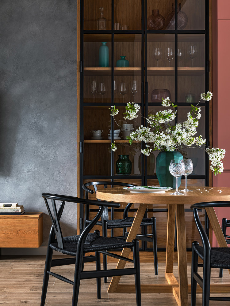 Зоной, объединяющей кухню и гостиную, служит обеденная группа с круглым раскладным столом, выполненным по чертежам дизайнеров из массива дуба. Высокий шкаф-витрина со стеклянными фасадами отлично сочетается с дверями в кабинет.