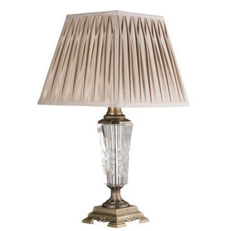 Металлическое основание цвета античная бронза, текстильный абажур нейтрально-бежевого цвета, декоративные элементы из хрусталя.