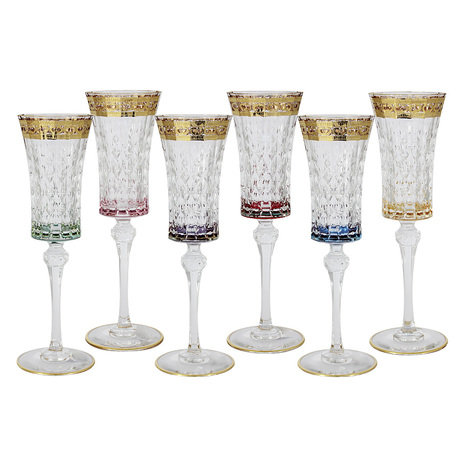 Набор из шести бокалов для шампанского необыкновенной красоты. Изготовлен из стекла с эффектной огранкой. Каждый бокал имеет золотую окантовку по краю и по основанию ножки, дно оттенено разными цветами. Купить набор бокалов - значит подчеркнуть свой безупречный вкус и достаток! Количество: 6 шт.