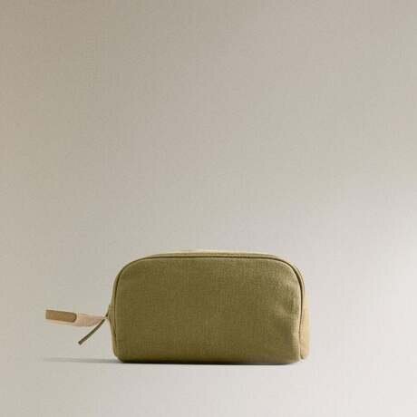 Косметичка из ткани цвета хаки с коричневой кожаной ручкой