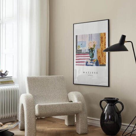 Расписной мотив голубой вазы с розовым букетом цветов. На заднем плане расположены красочные гобелены и окно с видом на океан. Оригинальный мотив был создан маслом на холсте Анри Матиссом в 1923 году. Мотив обрамлен встроенным бежевым паспарту.