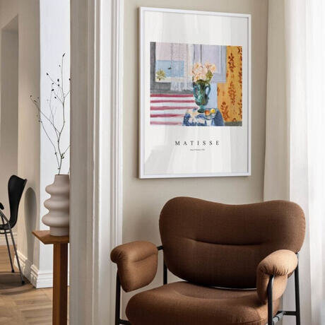 Расписной мотив голубой вазы с розовым букетом цветов. На заднем плане расположены красочные гобелены и окно с видом на океан. Оригинальный мотив был создан маслом на холсте Анри Матиссом в 1923 году. Мотив обрамлен встроенным бежевым паспарту.