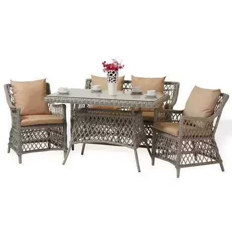 Идеально подойдёт для семьи из 3-4 человек или для приёма гостей на террасе загородного дома. Компактные размеры (120×70 см столешница) позволяют разместить комплект даже на просторном балконе городской квартиры. Светло-серое плетение с бежевыми подушками гармонично сочетается как с минималистичным скандинавским стилем, так и с классическим ландшафтным дизайном.Технические особенности: