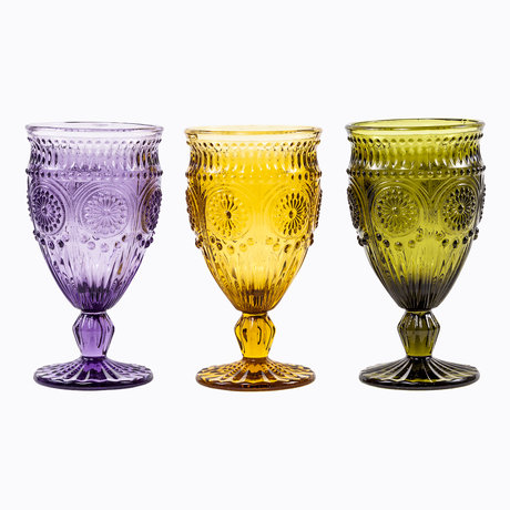 Комплект из 6-ти штук включает по 2 фужера 3-х цветов: янтарного, зеленого, сиреневого. Один из развлекательных светских ритуалов застолья - таблички с именами гостей за праздничным столом. Цвета, как известно, обладают символичностью. Поэтому цвет фужера тоже может исполнить роль гостевой визитной карточки. Остаётся лишь не перепутать цветовые символы.