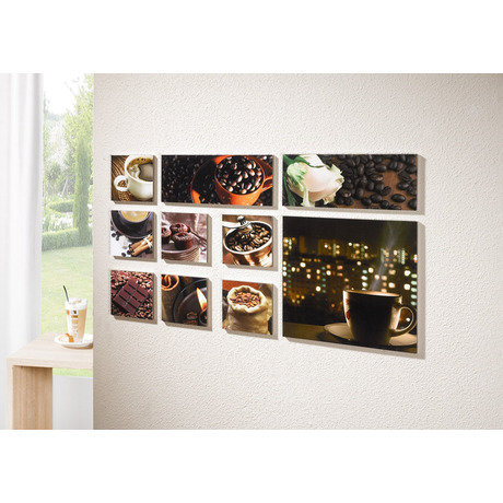 Печать на дереве, красивые мотивы с кофе, в теплых коричневых тонах. Порядок компановки может быть индивидуальным. 7 картин: 15 х 15см, 2 картины: 35 х 15см, 1 картина: 35 х 35см