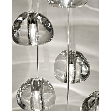 Одиночный подвесной светильник, выполненный в виде сферического кристалла, из знаменитого муранского стекла. Диаметр прозрачного сфероида - 11 сантиметров. Он удерживается на длинном подвесе, длина которого составляет 1,9 метров. Подвес выполнен из стального троса (металлической полой проволоки). Он крепится к круглому (прямоугольному) хромированному основанию, вмонтированному в потолок. Возможна отделка основания в оттенках - белый лак или никель. Каждый камень отливает потрясающими световыми бликами, и напоминает созданный самой природой, прозрачный горный хрусталь. Люстра идеально соответствует интерьеру в современной стилистике, отлично подходит к помещению в эко-стиле. Обработка стекла производится вручную. Светильник оставляет впечатление падающих капель. Возможны варианты обработки камней с приданием им угловатой формы. Производитель предлагает изменить оттенок светильника, добавив стеклянному сфероиду немного сусального золота или серебряного порошка. Светильник может иметь разные комплектации, от одного, до 26 камней в одной композиции на одном основании.