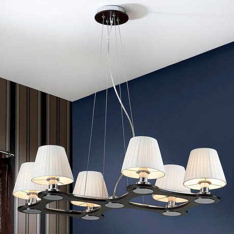 Подвесной светильник ASPEN выполнен в виде шести световых элемента под абажурами из плиссированной ткани оттенка парусины, размещенных на деревянном основании цвета красного дерева. Система крепления металлическая хромированная. Высота светильника регулируемая.