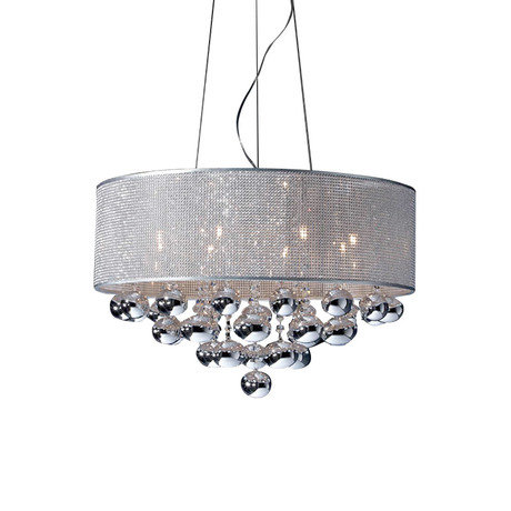 Подвесной светильник серии ANDROMEDA выполнен из полированной хромированной стали. Плафон - перфорированный винил с хромированным покрытием, внутри которого стеклянные хромированные шары на подвесах их граненого стекла. Высота регулируемая до 150 см.
