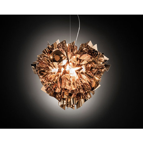 Подвесной светильник VELI LARGE с оригинальным дизайном. Плафон медного цвета выполнен из необычного материала под названием COPPERFLEX. Это материал, получаемый в процессе металлизации поликарбоната. В результате этого процесса появляется инновационный материал с абсолютно отражающей зеркальной поверхностью. При этом материалы сохраняют гибкость – важнейшее качество всех листовых материалов, используемых SLAMP. Высота светильника регулируется до 140 см. Дизайн: Adriano Rachele.