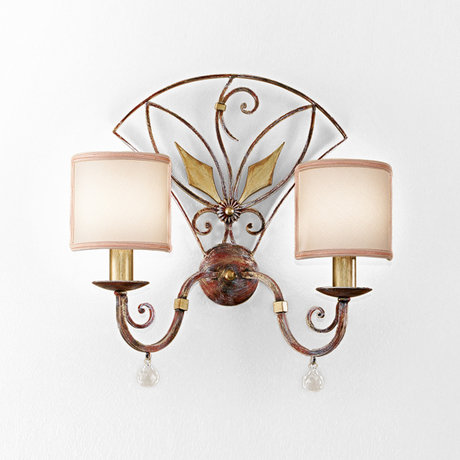 Бра серии EDEN  выполнен из кованого металла ручной работы. Элегантность и оригинальность данной модели придает ручное покрытие металлического основания: бордово-коричневый цвет с золотой патиной. Абажуры из термостойкой ткани. Светильник декорирован подвесками из хрусталя Asfour. Дизайнер - Matteo Valenti.