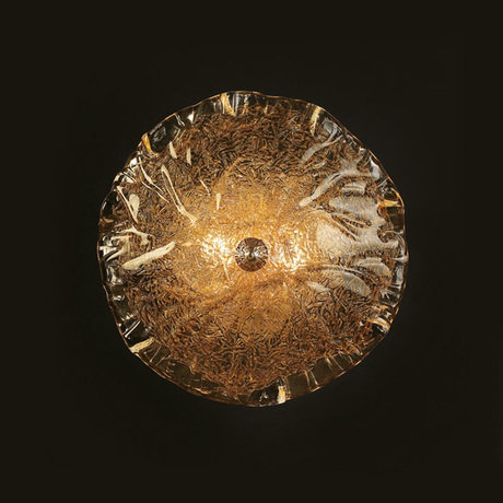 Бра выполнено из металла золотого цвета. Плафон из стекла ручной работы янтарного цвета. Все стекло для светильников изготавливается и формируется вручную. Кстати, в стекле полностью отсутствует свинец и это сильно усложняет работу мастеров, так как именно свинец делает стекло эластичным. Такое неэластичное стекло невозможно выдувать и фабрике пришлось разработать свои уникальные технологии работы со стеклом. Отказ от свинца и замена его органическим аналогом является важным шагом для сохранения здоровья человека и экологии. Идеальные пропорции и изящные линии сочетают в себе классические традиции и новаторство нашего времени. Изделия имеют органичные формы и цвета, вливаются в интерьер, делая его утонченнее и ярче. Количество лампочек: 2. Мощность: 2 x 40 Вт. Тип лампы: Галогенная, G9.