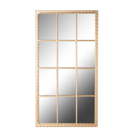 Зеркало в золотой металлической раме в виде окна прямоугольной формы. Окно-обманка - популярный дизайнерский прием, позволяющий добавить ощущение пространства там, где его не хватает. Такое зеркало станет стилистическим акцентом в интерьере fashion или эклектика.